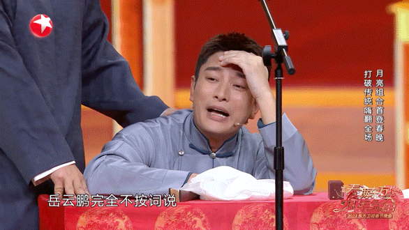贾乃亮在台上都要哭了,说自己看提词器都不知道往哪接,最后求岳云鹏配合一下,缓和了之后贾乃亮已经满头大汗了,不过这段的逗笑效果也很不错啦!